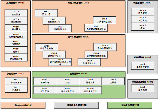 在過程維度方面,ASPICE 3.1共包含了8個過程組的32個過程,如下圖所示: